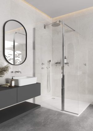 Ścianka Kerria Plus wykonana jest z 6 mm szkła hartowanego, pokrytego powłoką Active Cover. Ścianka nadaje pomieszczeniu przestronności, a prosta konstrukcja jest łatwa do utrzymania w czystości. Świetnie sprawdzi się zarówno w klasycznych, jak i nowoczesnych aranżacjach. Walk-in może być zastosowany jako pojedyncza ścianka lub element kabiny.