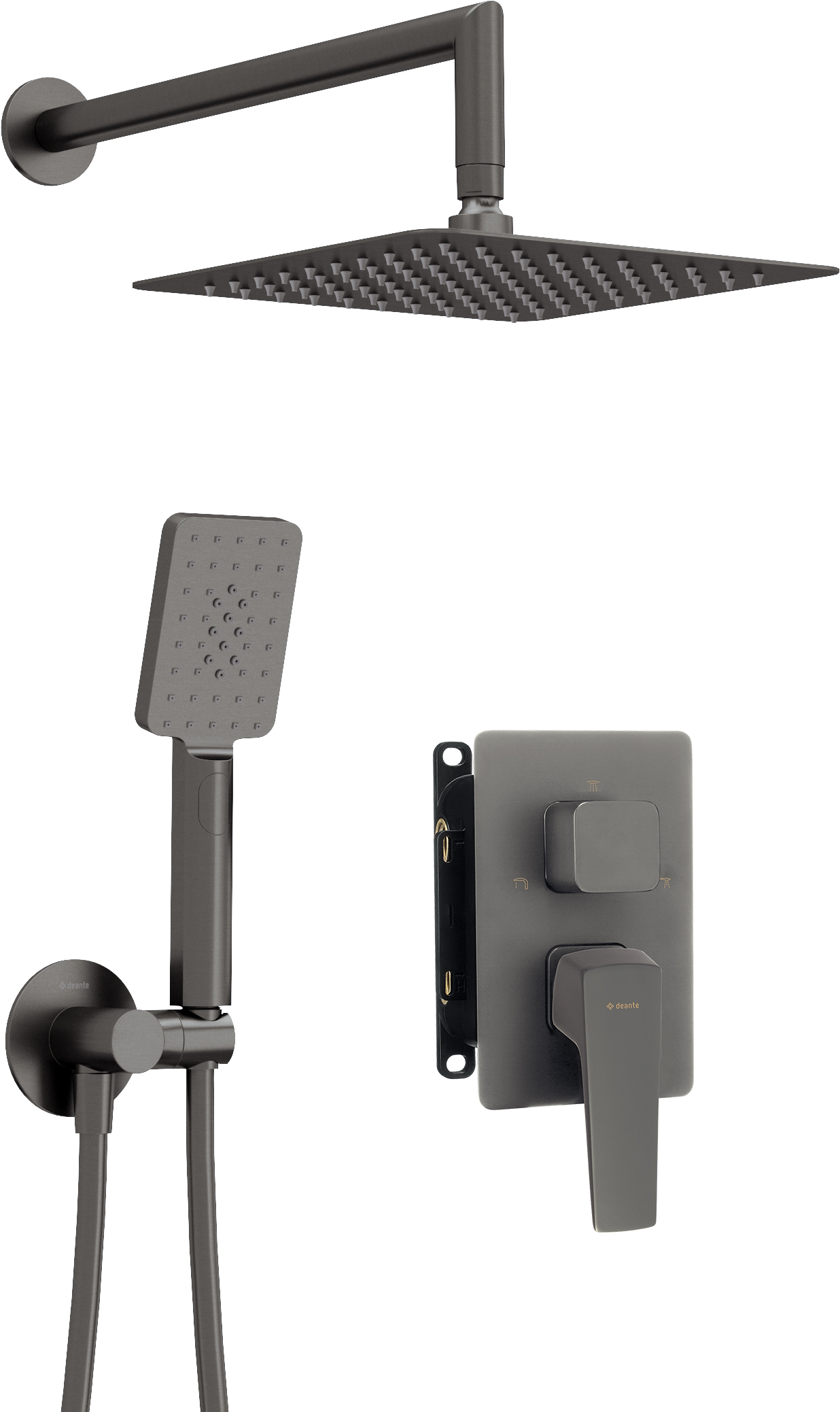 W ofercie dedykowany środek bezpieczny dla czyszczonych powierzchniUżycie dedykowanych środków powoduje, że powierzchnie nie niszczą się i długo pozostają gładkie, ułatwiając kolejne sprzątanie. Specjalnie dobrany skład usuwa najczęściej spotykane zabrudzenia niezwykle skutecznie. Z drugiej strony preparaty są łagodne dla danego typu nawierzchni (metal, granit, ceramika i inne), nie wchodząc z nimi w reakcje chemiczne. Preparaty są biodegradowalne i tym samym bezpieczne dla środowiska. Ze środkami do czyszczenia Deante utrzymanie nienagannego porządku będzie bardzo proste!Regulowany kąt nachylenia słuchawkiDeszczownia posiada ruchomy uchwyt na słuchawkę, dzięki temu możemy regulować kąt nachylenia główki prysznicowej. Wygodny montaż – możesz zainstalować BOX już teraz, a elementy zewnętrzne wybrać w dowolnym momencieZyskujesz dostęp do mechanizmu wewnętrznego Boxa, nawet po zakończeniu instalacji. Zamykana obudowa zabezpiecza mechanizm baterii podczas robót budowlanych. System Anti-calc ułatwiający usuwanie osadu kamiennegoNowatorski system Anti-calc wydłuża trwałość produktu, zapewnia niezawodność działania i znacząco ułatwia czyszczenie. Osadzanie się nalotu z kamienia na ujściach wody to całkowicie normalne zjawisko, w wyniku tego po pewnym czasie armatura traci na estetyce. Do przywrócenia pierwotnego wyglądu potrzeba zwykle uporczywego szorowania i specjalnych detergentów. Dzięki silikonowym dyszom Anti-calc pożegnasz się ze żmudnym sprzątaniem. Kamień bardzo łatwo usunąć przy codziennej kąpieli. Wystarczy przetrzeć delikatnie gąbką lub po prostu palcami, a głowica natryskowa i słuchawka wyglądają jak nowe Rekomendujemy systematyczne usuwanie osadu z dysz. Ponadczasowość i nieograniczone możliwości tworzeniaUniwersalna budowa BOXa umożliwia wymianę w dowolnym momencie klasycznej baterii mieszaczowej na termostatyczną i odwrotnie. W przyszłości łatwo zmienisz aranżację, wymieniając elementy zewnętrzne. System Anti-twist zapobiegający skręcaniu się wężaAnti-twist to system, który zapobiega skręcaniu się końcówki węża w trakcie jego użytkowania, co znacznie wpływa na komfort kąpieli. Możesz zapomnieć o konieczności rozplątywania go za każdym razem i stracie czasu. Poza tym, system Anti-twist zwiększa trwałość i niezawodność produktu.Komplementarność i kompleksowość oferty Do zewnętrznych komponentów BOXa – rozety i dźwigni – z łatwością dobierzesz baterie łazienkowe z tej samej serii oraz produkty uzupełniające.3-funkcyjny przełącznik natrysku z blokadą na 2 funkcjePod BOX podtynkowy mieszaczowy można podłączyć 3 funkcje: słuchawkę prysznicową, głowicę prysznicową oraz wylewkę. Ale istnieje również możliwość zablokowania jednej funkcji i wówczas można podłączyć według uznania: słuchawkę prysznicową i głowicę lub głowicę i wylewkę albo też słuchawkę prysznicową i wylewkę. Jeden BOX – klika możliwości. Innowacyjna wytrzymała i łatwa w czyszczeniu powłoka TitaniumGrafitowostalowa powierzchnia armatury Deante TITANIUM jest efektem zastosowania innowacyjnej technologii. Stanowi niezwykły kompromis między szarością, ciemnym grafitem, czernią, a nawet subtelnym odcieniem brązu – idealna ozdoba każdej aranżacji wnętrza. Struktura powierzchni jest wytrzymała, łatwa w utrzymaniu w czystości i nie przyjmuje odcisków palców.Montaż podtynkowy zapewnia estetykę łazienkiGłównymi zaletami montażu podtynkowego są estetyczny wygląd, prostsze utrzymanie łazienki w czystości oraz zamaskowanie nieatrakcyjnych elementów instalacji, które dzięki temu nie są narażone na uszkodzenia mechaniczne. Rozwiązania tego typu sprawdzą się także w małych łazienkach, w których ważny jest każdy centymetr. Po zastosowaniu systemu podtynkowego widoczne są jedynie ozdobne elementy natynkowe, a łazienka jest funkcjonalna, efektowna i świetnie wpisuje się w modny styl minimalistyczny.Korpus baterii wykonany z najwyższej jakości mosiądzuTylko najlepsze materiały, których jakość potwierdzamy badaniami w laboratorium